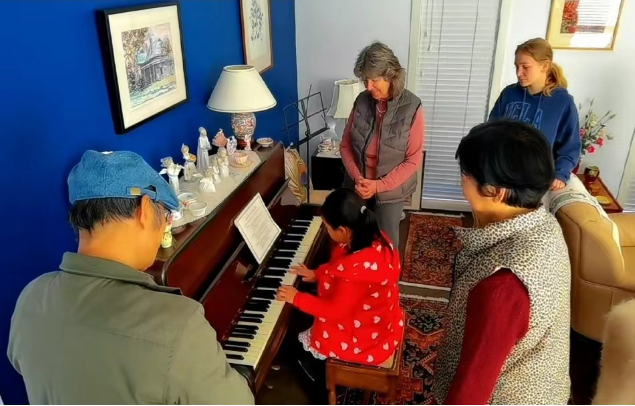 佟老师在耐心指导学员们练习书法的基本功,Marelyn和她的孙女以及学员们在练习书法。